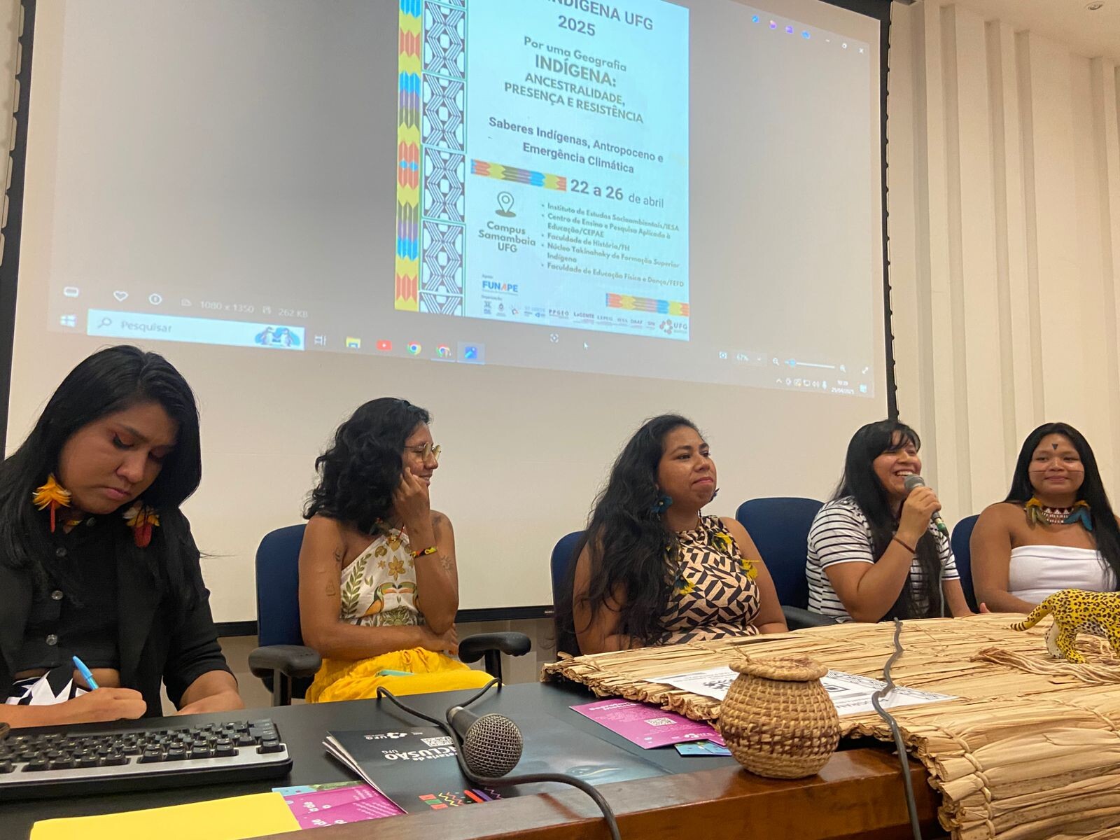 Ana Kuiaiu Trumai, do Povo Trumai, do Território Indígena do Xingu, estudante de Medicina Veterinária; Jordana Kudugudago, estudante de Nutrição, do povo Boe Bororo, Mato Grosso; Samila Marija Gonçalves, estudante de Filosofia; pertencente ao povo Caixana, na região do Alto Solimões, Amazonas. E a discente Mariana Cibaebo Ekureudo, estudante de Artes Visuais, pertencente ao povo Boe Bororo, Aldeia Meruri. As falas foram marcadas por reflexões potentes sobre os desafios enfrentados por estudantes indígenas no ambiente universitário, destacando a resistência, a afirmação identitária e a importância da representatividade nos espaços acadêmicos.